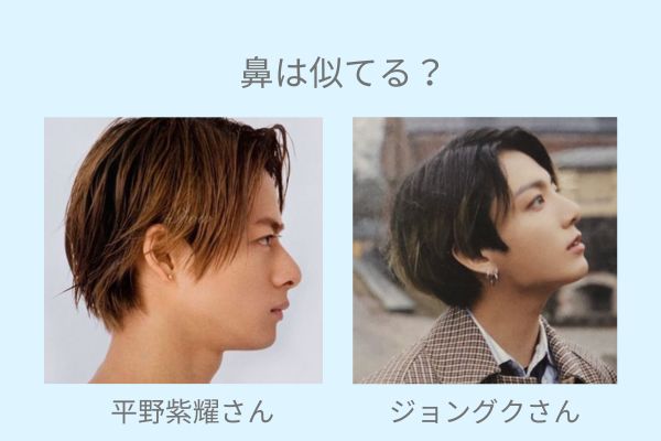 ジョングクさんと平野紫耀さん、お二人とも鼻の形がスッと高く、横顔も美しいです。