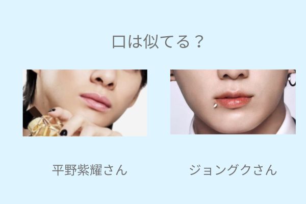 ジョングクさんと平野紫耀さんの口元の形は少し異なりますが、ふっくらとした唇が似ています。