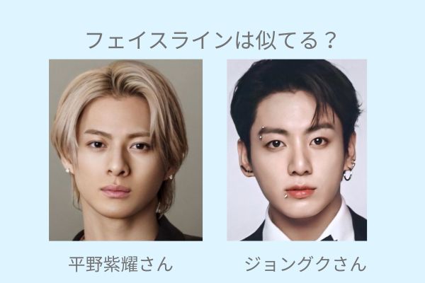 ジョングクさんと平野紫耀さんの顔の形は異なりますが、小顔でバランスの取れた配置は共通しています。