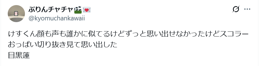 - 目黒蓮さんとけすさんは笑顔になった時の雰囲気や黒目の印象が重なり、似ていると感じることがある